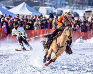 Skijor is a unique competition where skiers are towed at high speeds by horse and rider teams, navigating through a challenging course with gates, jumps, and various obstacles. Originating as a form of winter travel, this now competitive sport captures the rugged, adventurous spirit of The Rockies. The name is derived from the Norwegian word skikjøring, meaning “ski driving”.